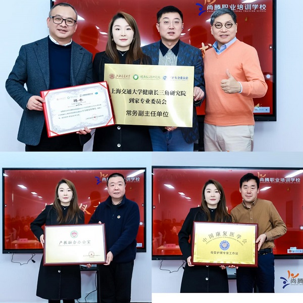 仪式上,仪式上,尚腾学校被授予上海交通大学健康长三角研究院到家专业委员会常务副主任单位、中国康复医学会母婴护理专家工作站、产教融合办公室多项荣誉资质。这标志着学校在学术支持、行业标准共建等方面迈出坚实步伐,将为人才培养注入更多科研与专业资源。